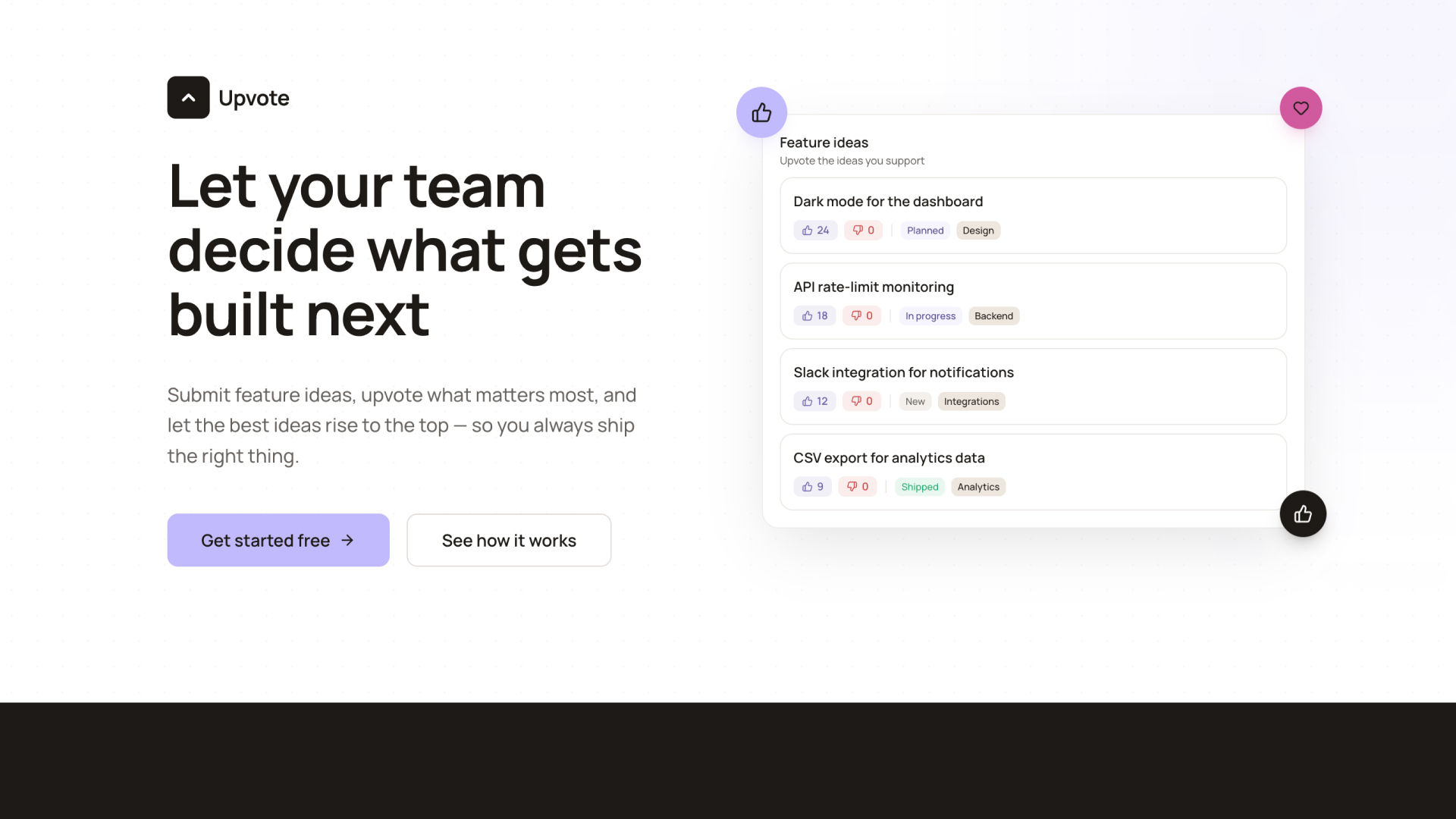 UpvoteCollaborative feature voting board where teams submit ideas, upvote priorities, and track requests from new to shipped